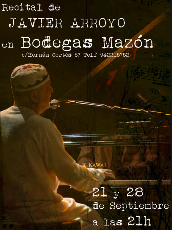 El músico vallisoletano Javier Arroyo nos deleitará en concierto con su piano el domingo 28 de septiembre desde las 21 horas y hasta las 23 horas en el Restaurante Bodegas Mazón en Santander, con entrada gratuita.