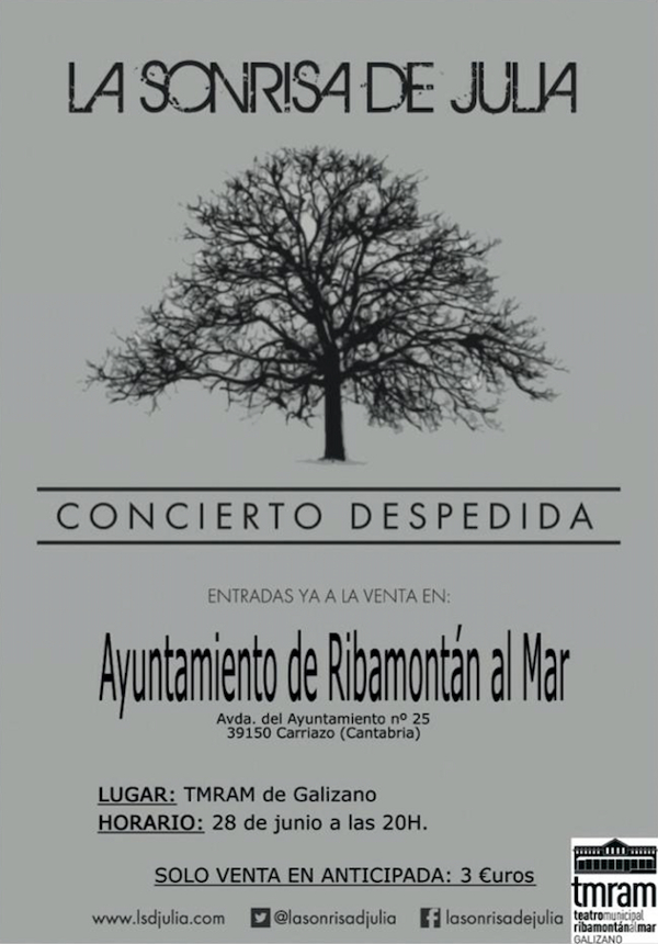 En el Teatro Municipal de Ribamontán al Mar en Galizano, a 13 minutos de nuestra casa rural, comenzará a la 20 horas del día 28 de junio el concierto despedida del grupo La Sonrisa de Julia.